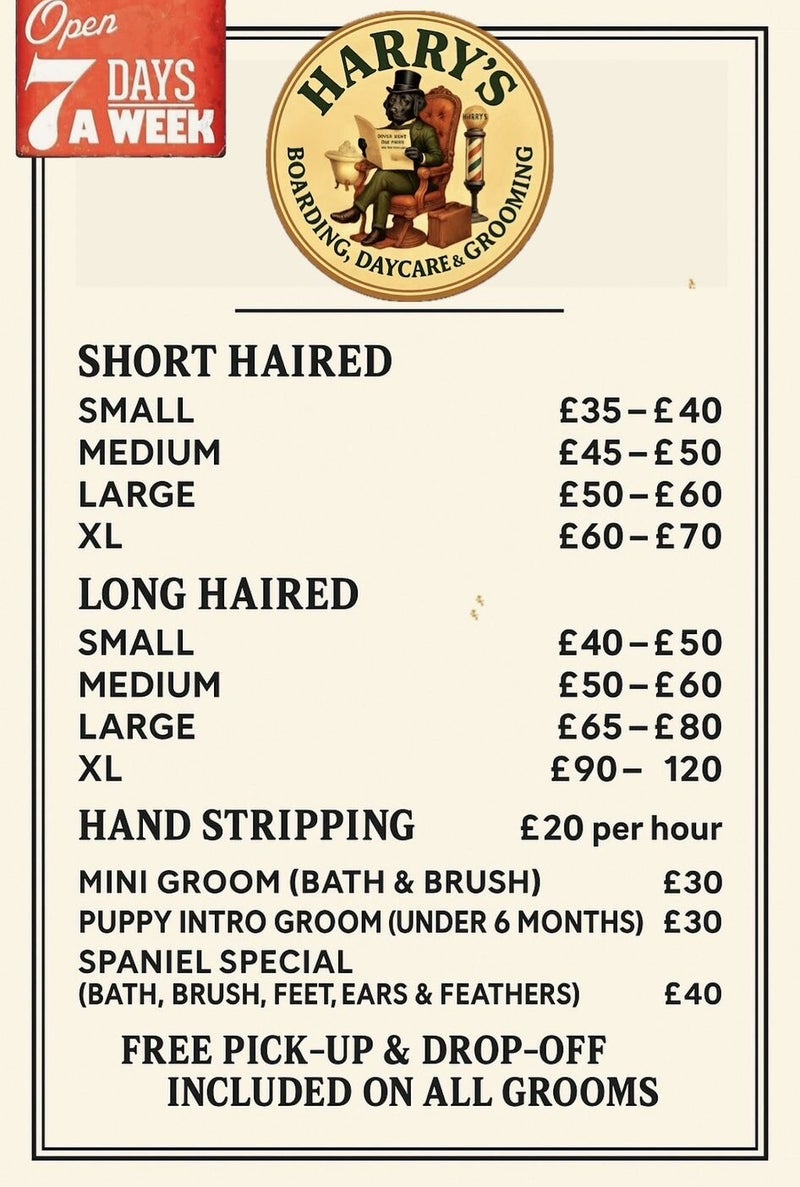 In addition to our home boarding and daycare services, we now offer professional dog grooming. I have set up a fully equipped grooming cabin in my garden to ensure every dog receives the highest standard of care in a comfortable setting. We are also pleased to provide a free door-to-door pick-up and drop-off service, making it even easier for your dog to enjoy our grooming services. R x
